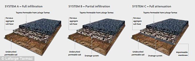 Canais de drenagem incorporados no entulho podem ajudar a aumentar a quantidade de água com que o sistema pode lidar.